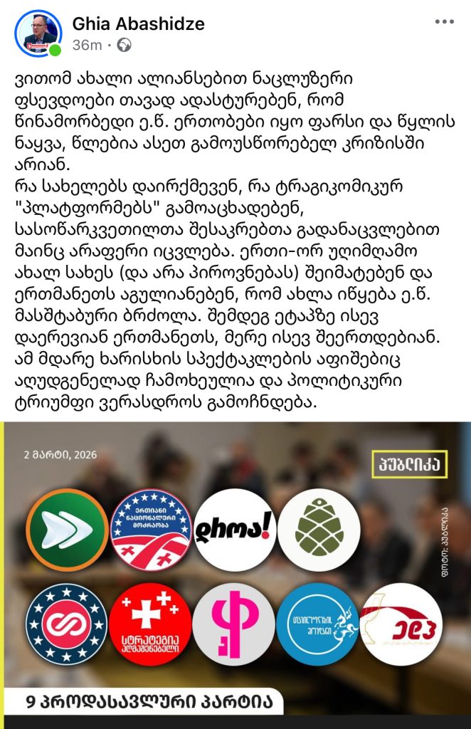 ვითომ ახალი ალიანსებით ნაცლუზერი ფსევდოები თავად ადასტურებენ, რომ წინამორბედი ე.წ. ერთობები იყო ფარსი და წყლის ნაყვა, წლებია ასეთ გამოუსწორებელ კრიზისში არიან.- წერს ანალიტიკოსი გია აბაშიძე სოციალურ ქსელში.