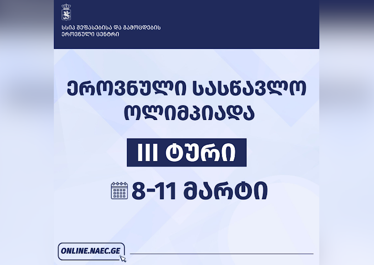 სსიპ შეფასებისა და გამოცდების ეროვნული ცენტრის ორგანიზებით, 2025-2026 წლის ეროვნული სასწავლო ოლიმპიადის III ტური 8 მარტს, 09:00 საათზე დაიწყება და 11 მარტს დასრულდება, – ინფორმაციას შეფასებისა და გამოცდების ეროვნული ცენტრი ავრცელებს.