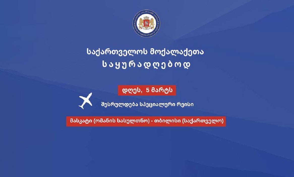 დღეს ადგილობრივი დროით 19:00 საათზე მასკატი – თბილისის სპეციალური რეისი შესრულდება, – ინფორმაციას საქართველოს საგარეო საქმეთა სამინისტრო ავრცელებს.
