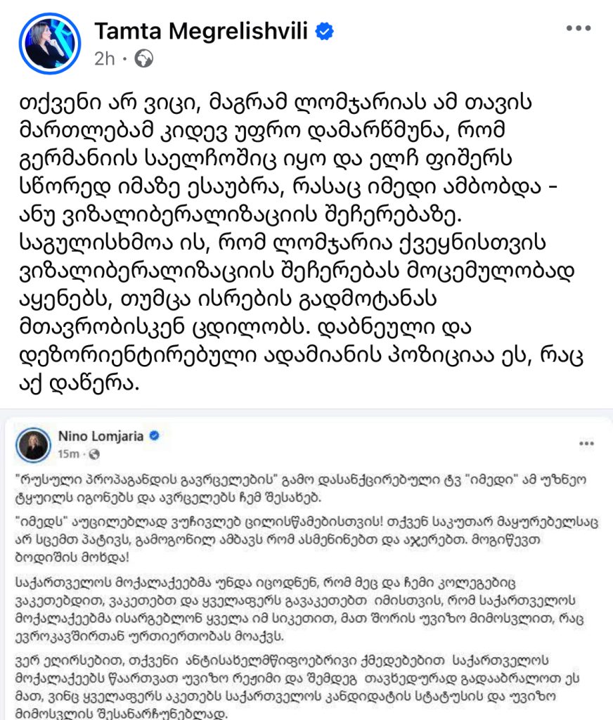 „ხალხის ძალის“ წევრი, თამთა მეგრელიშვილი, ნინო ლომჯარიას მიერ გამოქვეყნებულ პოსტს ეხმიანება,სადაც ლომჯარია წერს, რომ თითქოს ტელეკომპანია „იმედმა“ დეზინფორმაცია გაავრცელა და არ ყოფილა გერმანიის საელჩოში ელჩ ფიშერთან შეხვედრაზე.
