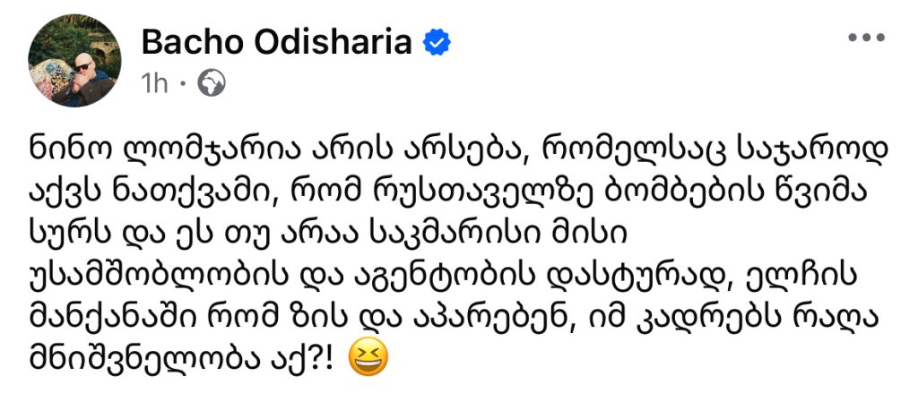 ეროვნული კინოცენტრის ფილმწარმოების დეპარტამენტის უფროსი, ბაჩო ოდიშარია, სოციალურ ქსელში ეხმიანება ნინო ლომჯარიას გერმანიის საელჩოში ვიზიტს.