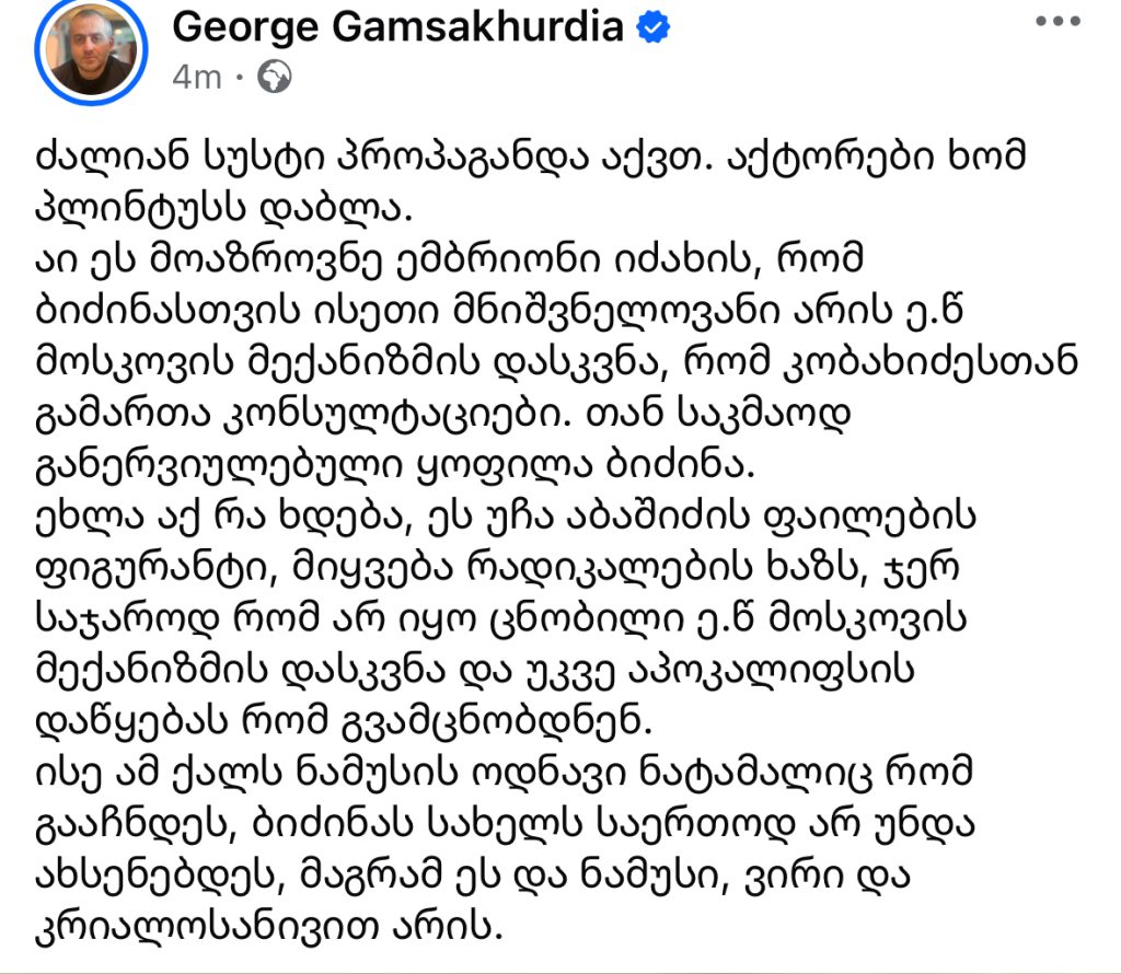 აი ეს მოაზროვნე ემბრიონი იძახის, რომ ბიძინასთვის ისეთი მნიშვნელოვანი არის ე.წ მოსკოვის მექანიზმის დასკვნა, რომ კობახიძესთან გამართა კონსულტაციები. თან საკმაოდ განერვიულებული ყოფილა ბიძინა.