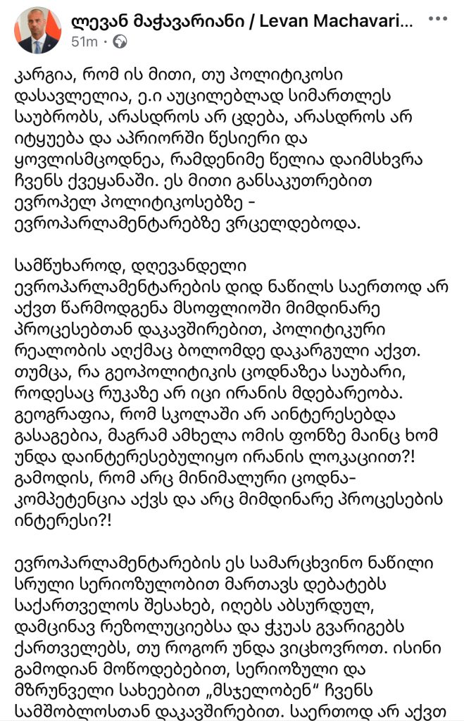 სამწუხაროდ, დღევანდელი ევროპარლამენტარების დიდ ნაწილს საერთოდ არ აქვთ წარმოდგენა მსოფლიოში მიმდინარე პროცესებთან დაკავშირებით, პოლიტიკური რეალობის აღქმაც ბოლომდე დაკარგული აქვთ. თუმცა, რა გეოპოლიტიკის ცოდნაზეა საუბარი, როდესაც რუკაზე არ იცი ირანის მდებარეობა, – წერს ფრაქცია „ქართული ოცნების“ თავმჯდომარის პირველი მოადგილე, ლევან მაჭავარიანი სოციალურ ქსელში.
