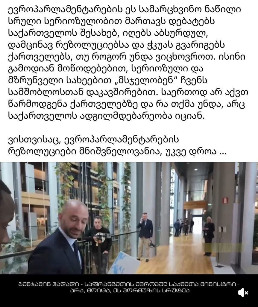 ევროპარლამენტარების ეს სამარცხვინო ნაწილი სრული სერიოზულობით მართავს დებატებს საქართველოს შესახებ, იღებს აბსურდულ, დამცინავ რეზოლუციებსა და ჭკუას გვარიგებს ქართველებს, თუ როგორ უნდა ვიცხოვროთ. ისინი გამოდიან მოწოდებებით, სერიოზული და მზრუნველი სახეებით „მსჯელობენ“ ჩვენს სამშობლოსთან დაკავშირებით. საერთოდ არ აქვთ წარმოდგენა ქართველებზე და რა თქმა უნდა, არც საქართველოს ადგილმდებარეობა იციან.