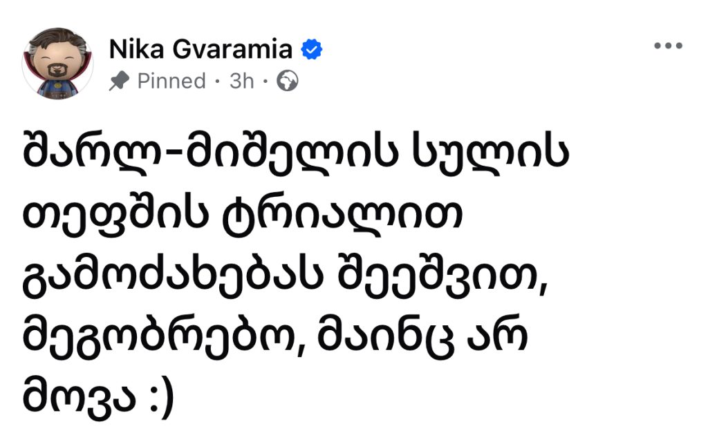 შარლ მიშელის სულის თეფშის ტრიალით გამოძახებას შეეშვით, მეგობრებო, მაინც არ მოვა, – ამის შესახებ პარტია „ახლის“ ლიდერმა, ნიკა გვარამიამ სოციალურ ქსელში დაწერა.