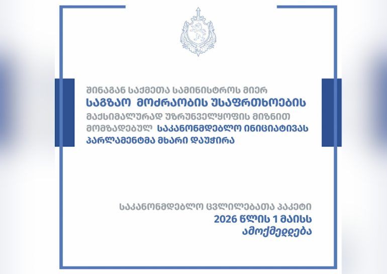 საქართველოს შინაგან საქმეთა სამინისტროს მიერ შემუშავებულ საკანონმდებლო ცვლილებათა პაკეტს, რომლის მთავარ მიზანს საგზაო მოძრაობის წესების მაქსიმალურად უზრუნველყოფა და საგზაო-სატრანსპორტო შემთხვევების პრევენცია წარმოადგენს, პარლამენტმა მესამე მოსმენით მხარი დაუჭირა.