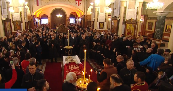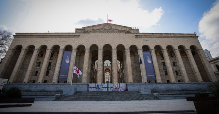 პარლამენტის სასახლეზე საქართველოს კათოლიკოს-პატრიარქის ილია მეორის ფოტოები განთავსდა (ვიდეო)