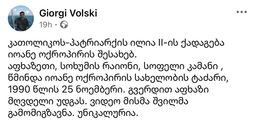 “კათოლიკოს-პატრიარქი ილია II ქადაგებს იოანე ოქროპირის შესახებ, სოხუმის რაიონი სოფელი კამანში, ვიდეო აფხაზი მღვდლის შვილმა გამომიგზავნა”