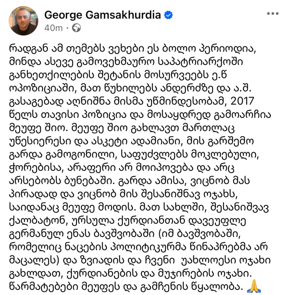 “მინდა გამოვეხმაურო საპატრიარქოში განხეთქილების შეტანის მოსურვეებს ე.წ. ოპოზიციაში, მათ წუხილებს ანდერძზე და ა.შ”