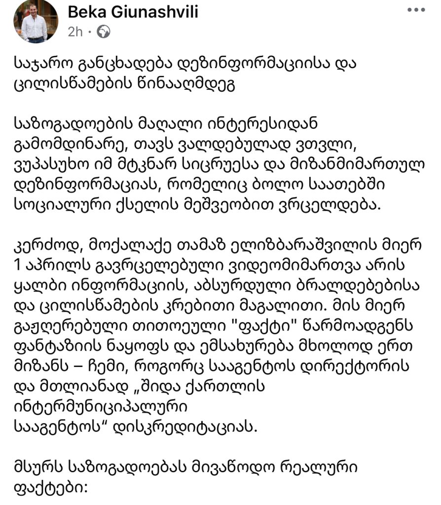 კერძოდ, მოქალაქე თამაზ ელიზბარაშვილის მიერ 1 აპრილს გავრცელებული ვიდეომიმართვა არის ყალბი ინფორმაციის, აბსურდული ბრალდებებისა და ცილისწამების კრებითი მაგალითი. მის მიერ გაჟღერებული თითოეული “ფაქტი” წარმოადგენს ფანტაზიის ნაყოფს და ემსახურება მხოლოდ ერთ მიზანს – ჩემი, როგორც სააგენტოს დირექტორის და მთლიანად „შიდა ქართლის ინტერმუნიციპალური სააგენტოს“ დისკრედიტაციას.
