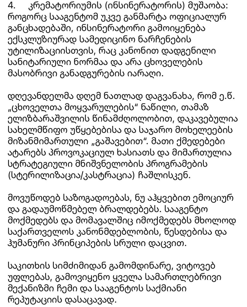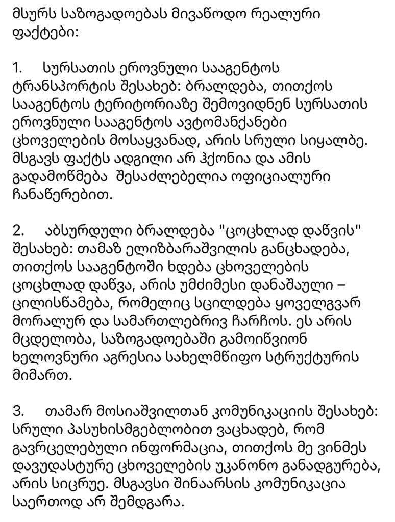 3. თამარ მოსიაშვილთან კომუნიკაციის შესახებ: სრული პასუხისმგებლობით ვაცხადებ, რომ გავრცელებული ინფორმაცია, თითქოს მე ვინმეს დავუდასტურე ცხოველების უკანონო განადგურება, არის სიცრუე. მსგავსი შინაარსის კომუნიკაცია საერთოდ არ შემდგარა.