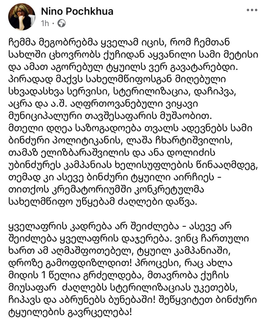 ყველაფრის კადრება არ შეიძლება – ასევე არ შეიძლება ყველაფრის დაჯერება. ვინც ჩართული ხართ ამ აღმაშფოთებელ, ტყუილ კამპანიაში, დროზე გამოფდიზლდით! პროცესი, რაც ახლა მიდის 1 წელია გრძელდება, მთავრობა ქუჩის მიუსაფარ ძაღლებს სტერილიზაციას უკეთებს, ჩიპავს და აბრუნებს ბუნებაში! შეწყვიტეთ ბინძური ტყუილების გავრცელება!“ – წერს ფოჩხუა.