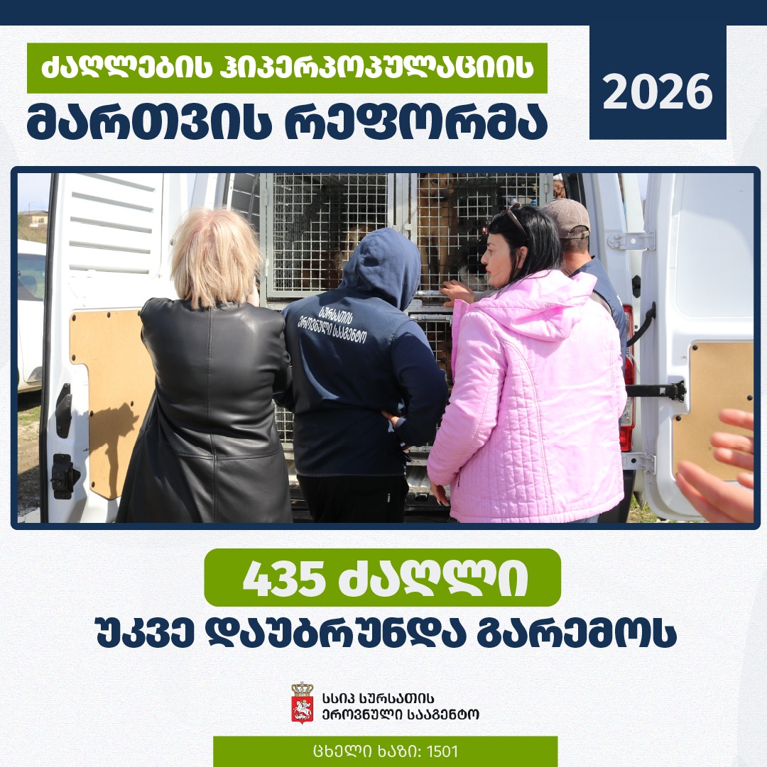 სურსათის ეროვნული სააგენტოს ინფორმაციით, 10 მარტიდან 2 აპრილის ჩათვლით ძაღლების ჰიპერპოპულაციის პროგრამის ფარგლებში, კახეთის, იმერეთის რეგიონებსა და ზუგდიდის მუნიციპალიტეტში, აყვანილია 502 ძაღლი (კახეთი – 423, იმერეთი – 22, ზუგდიდი – 57).