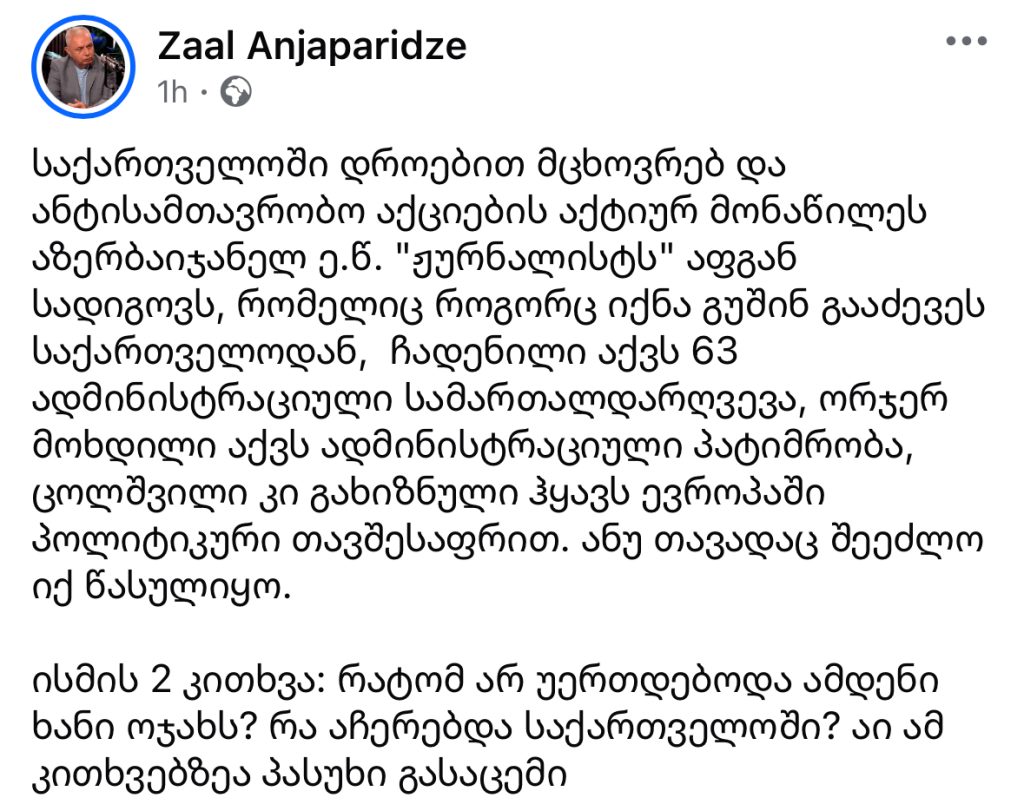 ანალიტიკოსი ზაალ ანჯაფარიძე, აზერბაიჯანელი ჟურნალისტის, აფგან სადიგოვის საქართველოდან გაძევებას სოციალურ ქსელში ეხმიანება.