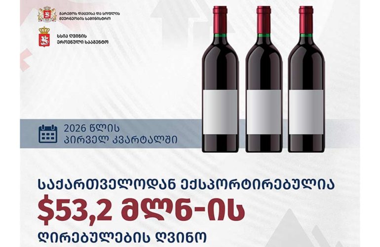 მიმდინარე წლის პირველ კვარტალში საქართველოდან მსოფლიოს 51 ქვეყანაში 17,3 მლნ ლიტრი ღვინოა ექსპორტირებული