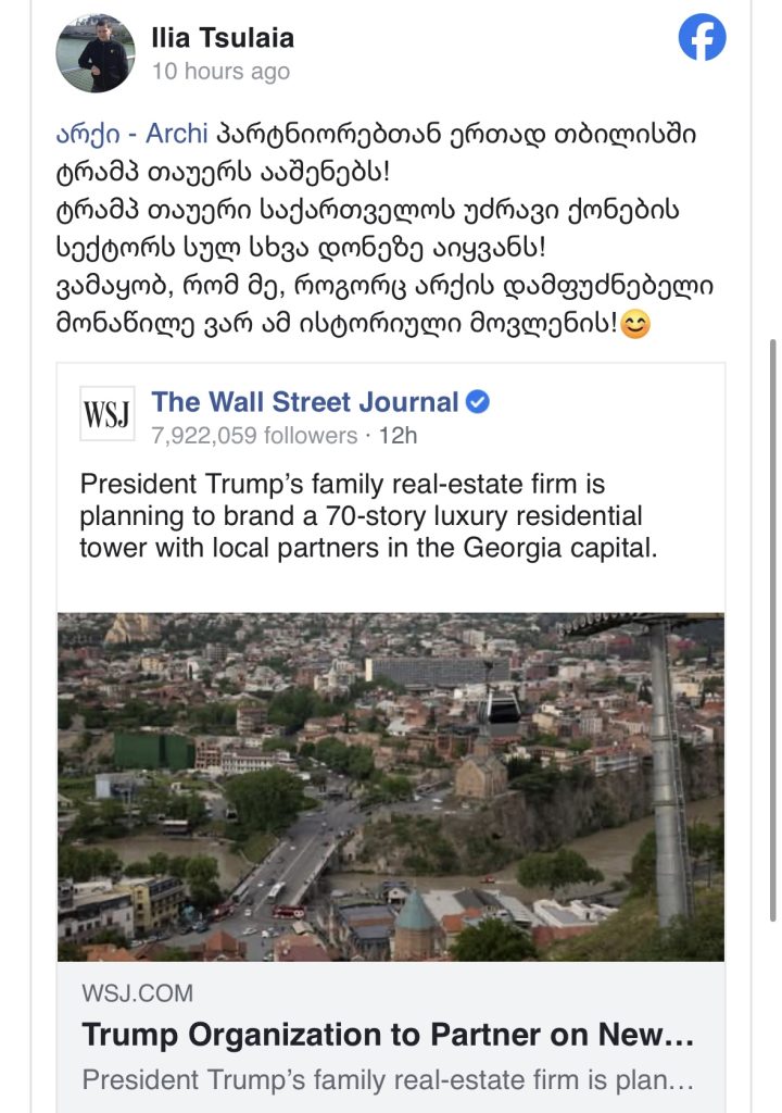 ილია წულაია – „არქი“ პარტნიორებთან ერთად თბილისში „ტრამპ თაუერს“ ააშენებს, ვამაყობ, რომ ამ ისტორიული მოვლენის მონაწილე ვარ