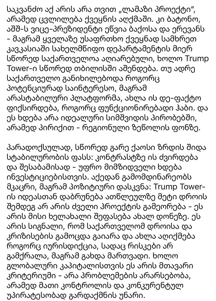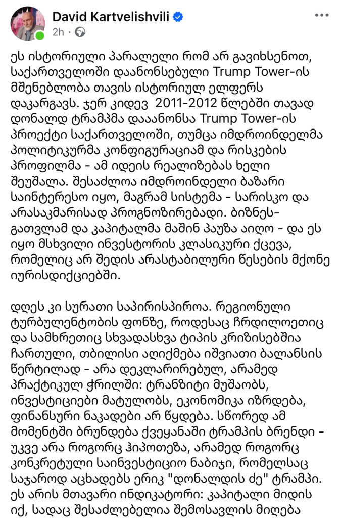 პარადოქსულად, სწორედ გარე ქაოსი ზრდის შიდა სტაბილურობის ფასს: კონტრასტზე ის ძვირდება და შესაბამისად, უფრო მიმზიდველი ხდება ინვესტიციებისთვის. აქედან გამომდინარეობს მკაცრი, მაგრამ პოზიტიური დასკვნა: Trump Tower-ის იდეასთან დაბრუნება ათწლეულზე მეტი დროის შემდეგ არ არის ძველი პროექტის გამეორება, ეს არის მისი ხელახალი შეფასება ახალ დონეზე. ეს არის სიგნალი, რომ საქართველომ დროისა და კრიზისების გამოცდა გაიარა და ახლა აღიქმება როგორც იურისდიქცია, სადაც რისკები არ გამქრალა, მაგრამ გახდა მართვადი. ხოლო გლობალური კაპიტალისთვის ეს არის მთავარი კრიტერიუმი, არა პრობლემების არ არსებობა, არამედ მათი კონტროლის და კონკურენტულ უპირატესობად გარდაქმნის უნარი,“ – წერს დავით ქართველიშვილი.