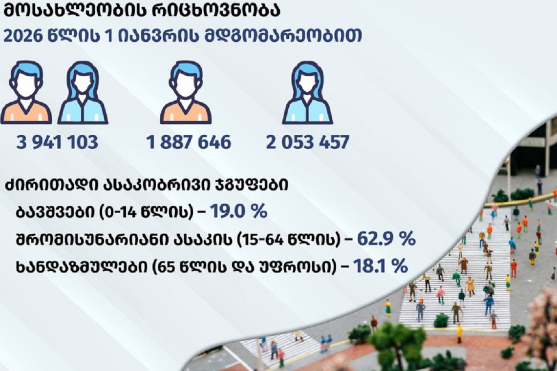 საქსტატის მონაცემებით საქართველოს მოსახლეობის რიცხოვნობამ 3 941.1 ათასი ადამიანი შეადგინა, საიდანაც მოსახლეობის 48% კაცია, ხოლო 52% – ქალი
