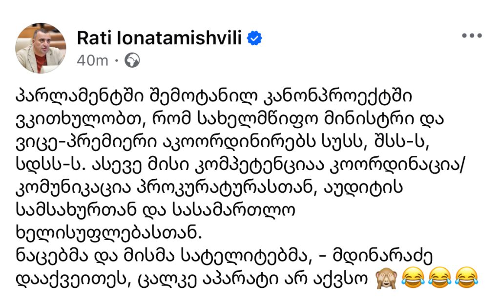 ნაცებმა და მისმა სატელიტებმა, – მდინარაძე დააქვეითეს, ცალკე აპარატი არ აქვსო,”- წერს რატი იონათამიშვილი.