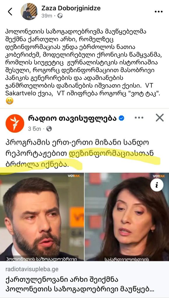 “პოლონეთის საზოგადოებრივმა მაუწყებელმა შექმნა ქართული არხი, რომელზეც დეზინფორმაციას უნდა ებრძოლოს ნათია კობერიძემ, მოდელირებული ქრონიკის წამყვანმა, რომლის სიუჟეტიც ჟურნალისტიკის ისტორიაშია შესული, როგორც დეზინფორმაციით მასობრივი პანიკის გენერირების და ადამიანების ჯანმრთელობის დაზიანების იშვიათი ქეისი. VT Sakartvelo ქვია, VT იშიფრება როგორც “ვოტ ტაკ”.” – წერს დობორჯგინიძე.