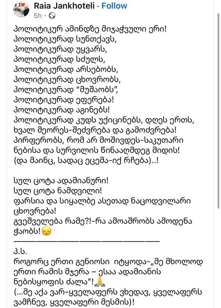 ბიზნესმენი რაია ჯანხოთელი სოციალურ ქსელში პოსტს აქვეყნებს, რომელსაც უცვლელად გთავაზობთ.