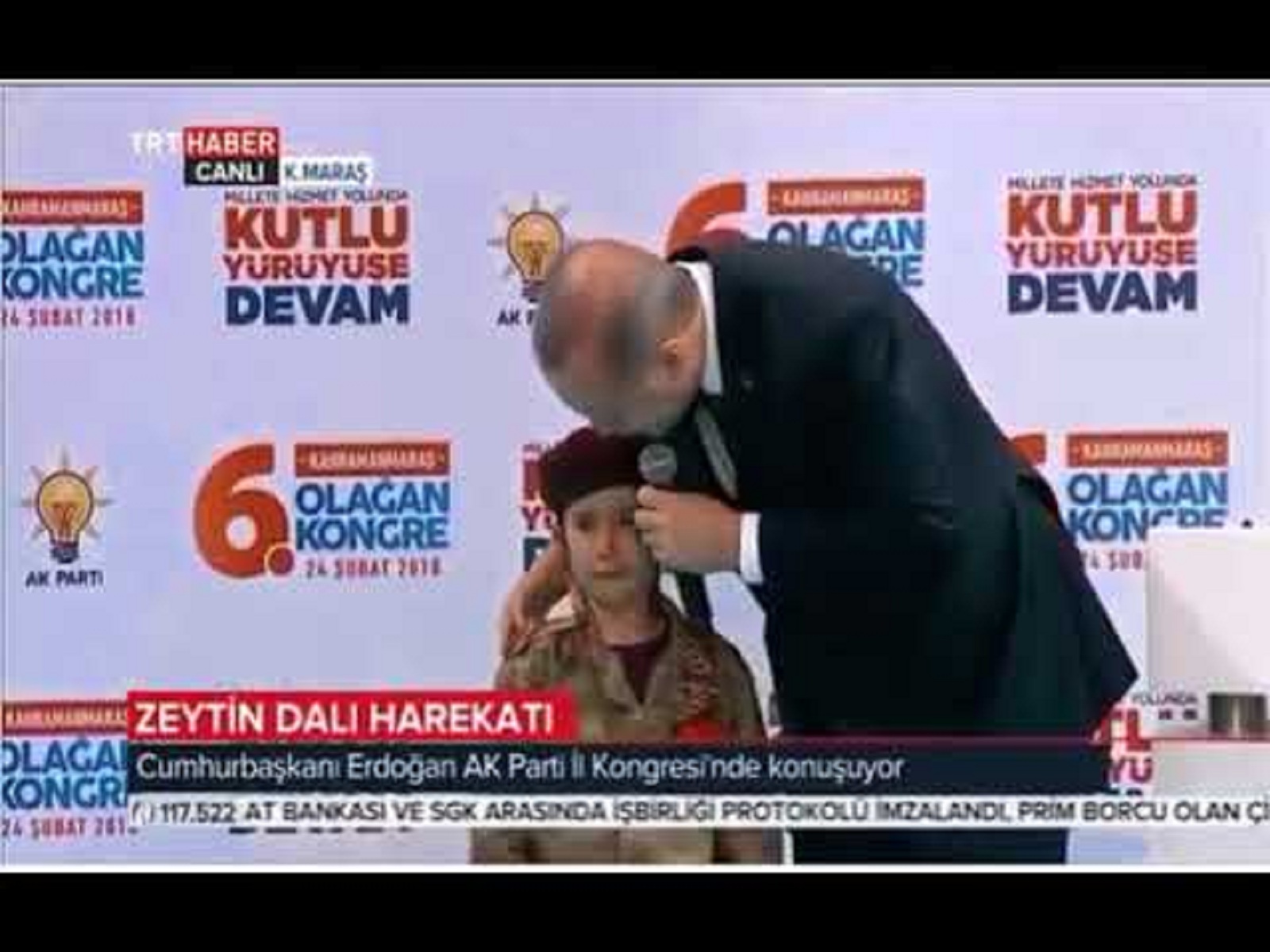 თურქეთის პრეზიდენტი რეჯეფ თაიფ ერდოღანი მწვავედ გააკრიტიკეს ას შემდეგ, რაც სამხედრო ფორმაში ჩაცმულ პატარა გოგოს უთხრა, რომ მისთვის პატივი იქნება, სამხედრო მოქმედების დროს რომ დაიღუპოს. “ის რომ ეწამოს, მას დროშას გადააფარებენ”, – უთხრა მან ატირებულ ბავშვს ანკარაში კონგრესთან შეხვედრის დროს.