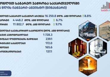 სტატისტიკის ეროვნული სამსახურის მონაცემებით, 2025 წლის იანვარ-აგვისტოში საქართველოში საქონლით საგარეო სავაჭრო ბრუნვამ, არადეკლარირებული ვაჭრობის გარეშე, 16 250.8 მლნ. აშშ დოლარი შეადგინა, რაც წინა წლი…