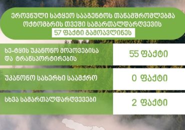 ეროვნული სატყეო სააგენტოს თანამშრომლებმა, მიმდინარე წლის ოქტომბრის თვეში, სამართალდარღვევის 57 ფაქტი გამოავლინეს. ამის შესახებ ინფორმაციას გარემოს დაცვისა და სოფლის მეურნეობის სამინისტრო ავრცელებს. მა…