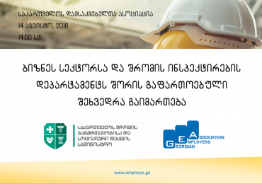 14 აგვისტოს, 14:00 საათზე, ბიზნეს გაერთიანება – საქართველოს დამსაქმებელთა ასოციაციის წევრი და პარტნიორი კომპანიები შრომის უსაფრთხოების ინსპექციის ხელმძღვანელ პირებთან შეხვედრას გამართავენ. ბიზნე…