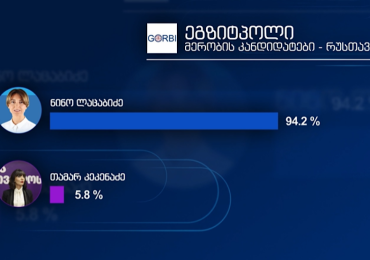 GORBI-ს ეგზიტპოლის თანახმად, რუსთავის მერი „ქართული ოცნების“ კანდიდატი, ნინო ლაცაბიძე გახდა. მან ამომრჩეველთა ხმების 94,2% მიიღო. მეორე ადგილზე ოპოზიციის კანდიდატი თამარ კეკენაძე გავიდა (5,8%). ტელეკო…